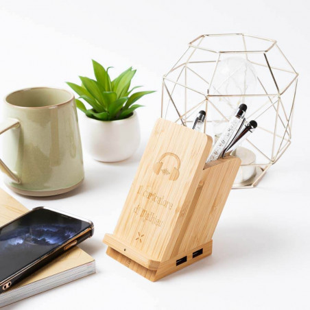 Esponi sulla tua scrivania questo grazioso accessorio in legno di bambù intrecciato.Questo accessorio multifunzionale è composto da un portapenne, un porta smartphone, un caricabatterie wireless e un hub USB.Un articolo pratico e un'ottima idea regalo per l'ufficio o per il ritorno a scuola.