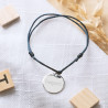 Gioielli semplici, eleganti e unisex con medaglia rotonda in argento 925 da personalizzare.Incisione di un nome o di un messaggio sul cerchio d'argento.Quindi regola facilmente questo braccialetto al tuo polso grazie al cordoncino in tessuto satinato facilmente regolabile.