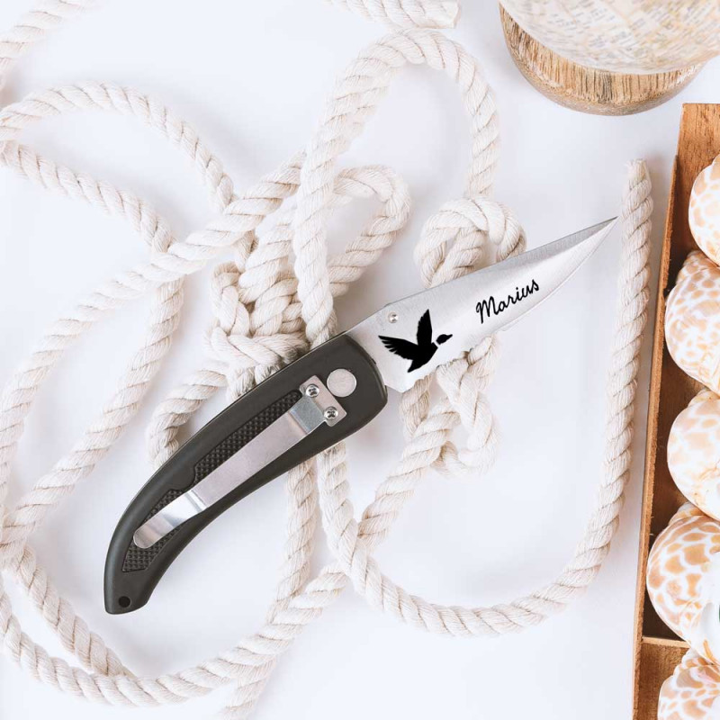Per il vostro uomo, optare per un coltello sorprendente e unico dove è possibile incidere il testo di vostra scelta. Un'idea che segnerà i vostri cari nella loro vita quotidiana su una passeggiata, nella foresta o in mare.