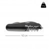 Pratico coltello multifunzione nero con incisione testo sul manico.