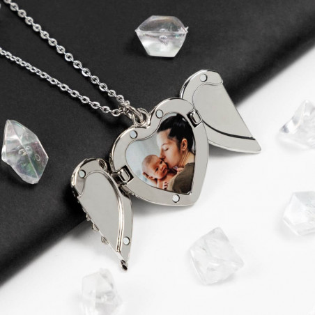 Uno collana di metallo personalizzato che piace molto. Infatti, il ciondolo a forma di cuore si apre per contenere foto di persone amate che vi contano all'interno. Questo gioiello ricorda i gioielli più vecchi che spesso appaiono sotto forma di medaglione per collane e orologi. Così puoi stampare la tua foto in questo cuore e offrirla a tua madre come gioiello unico per il giorno della madre. La faccia anteriore con queste belle ali rendono gioielli un modello unico.