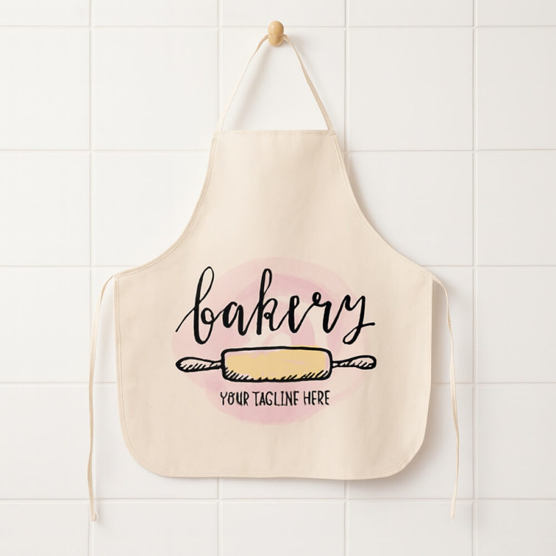 Spesso grembiule in tessuto beige con personalizzazione.