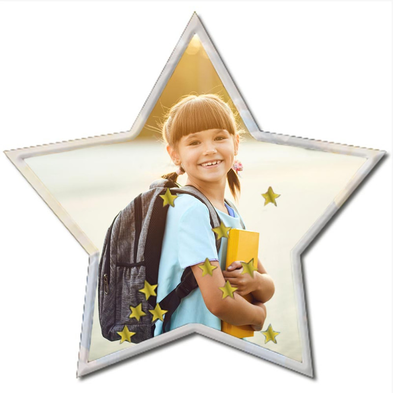 Un oggetto così carino e originale che ti piacerà personalizzare questa stella palla di neve con la tua foto. Paillettes a forma di stella.