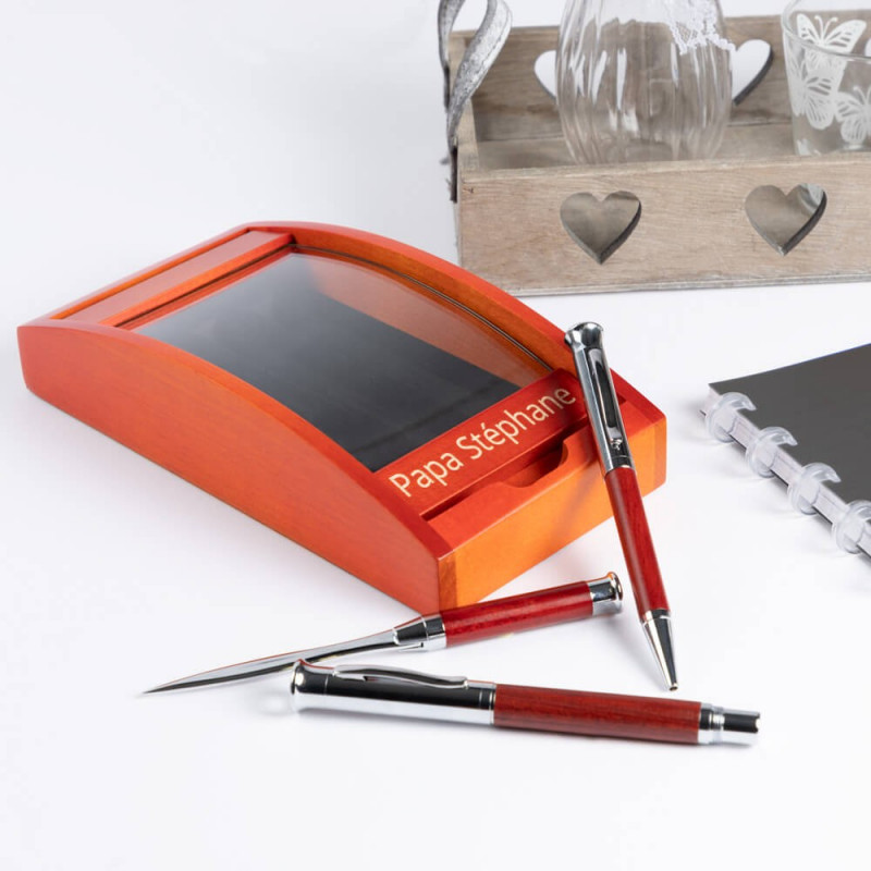 Molto bello pen trim con la sua scatola di legno con un vetro trasparente che dà un bellissimo display. Scopri questo elegante e raffinato set di penne da offrire per segnare belle occasioni. Bruciare sul coperchio di legno un nome, le iniziali, o un messaggio come "Ti amo" a tuo marito. Per essere posizionato sulla scrivania o sul tuo spazio di lavoro, questo set funzionerà con parenti, colleghi o clienti.