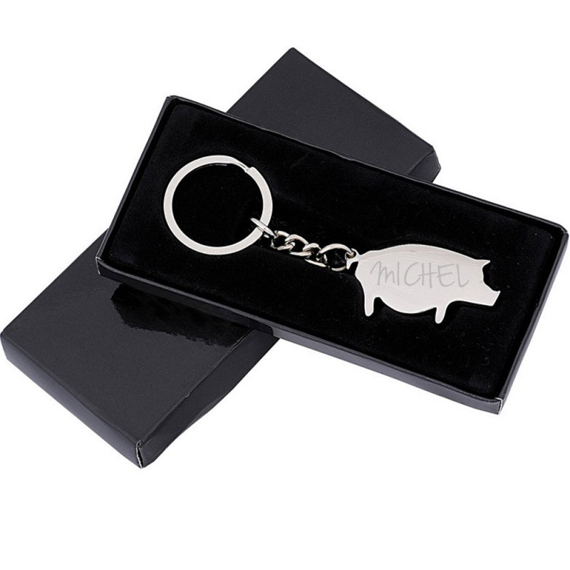 Il tuo testo inciso sulla parte anteriore di questo portachiavi in metallo argentato a forma di maiale.Portachiavi carino e molto originale.